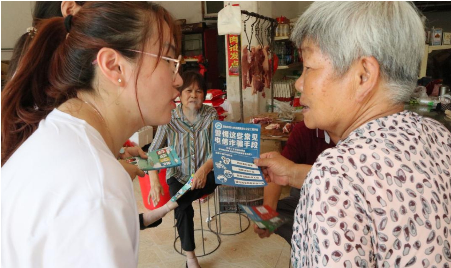 ▲上图为团队成员对居民进行防诈骗宣传