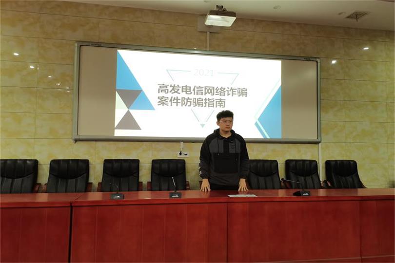 会议开始前,组织部同学向参会同学发放防范电信网络诈骗宣传册。会议上,宣讲员霍俣铖向同学们认真讲解了六类高发诈骗手段并对相关案件进行了剖析,主要有贷款类诈骗、刷单兼职类诈骗、网络交友诱导赌博投资诈骗、冒充客服退款诈骗、冒充公检法类诈骗以及消除校园贷记录、不良记录诈骗。并强调,同学们要提高自身的安全防范意识,浏览安全正规的网页;遇到问题应通过正规渠道寻求帮助,不可听信一面之词;遇到可疑信息或电话应及时咨询官方;发现有违法诈骗行为要立即报警,维护自身的合法权益等。