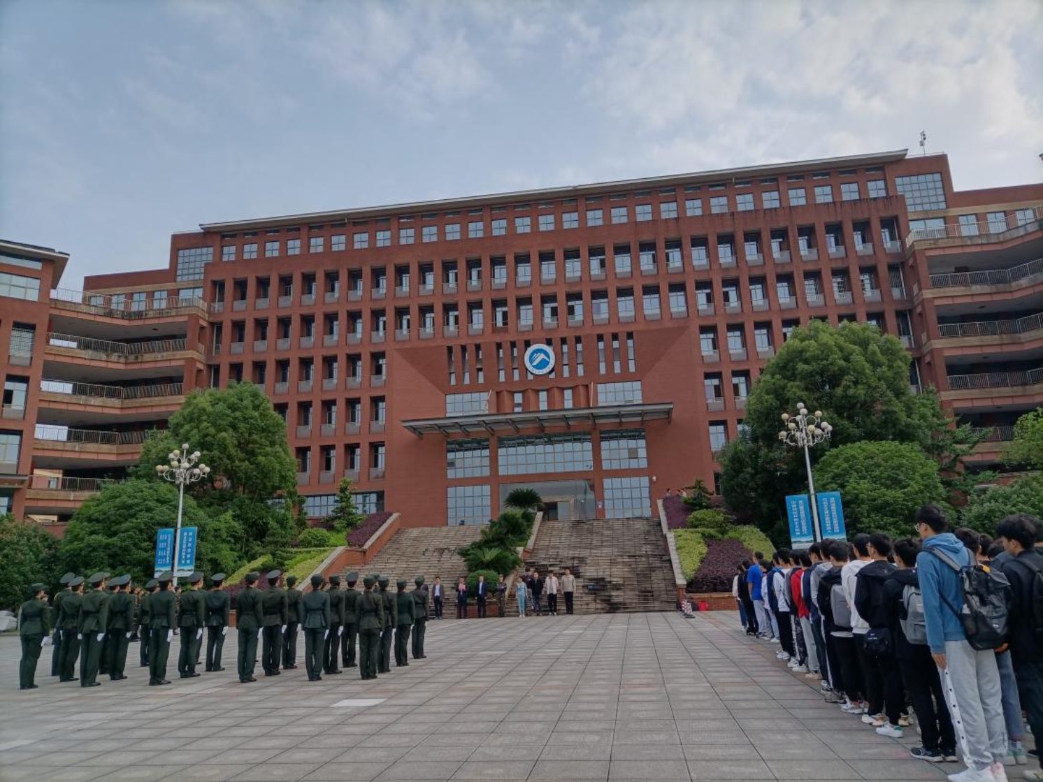 参训学生迈着整齐的步伐走向升旗台,他们手握钢枪,眼神坚定,英姿飒爽。伴随着中华人民共和国国歌,鲜艳的五星红旗在升旗手手中展开、迎风飘扬。全场数百名师生注视着国旗,共唱中华人民共和国国歌。