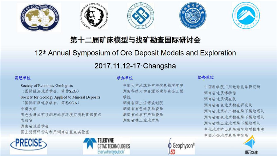 2017年11月12-17日,第十二届矿床模型与找矿勘查国际研讨会在长沙中南大学新校区外国语楼成功召开。本次会议由国际经济地质学会(SEG)、国际矿床地质学会(SGA)、中南大学和湖南省地质学会等单位共同发起,由中南大学地球科学与信息物理成人漫画 、成人漫画 、湖南省国土资源规划院和湖南省有色地质勘查局等多家单位承办,中国科成人漫画 广州地球化学研究所、湖南省地质科学研究院等单位协办。会议就造山型金矿床、矽卡岩矿床、岩浆铜镍硫化物矿床、钨锡矿床、斑岩矿床、VMS和MVT等不同类型矿床的大地构造背景、区域成矿条件,矿床地质特征、矿床成因以及找矿勘查等内容进行研讨。