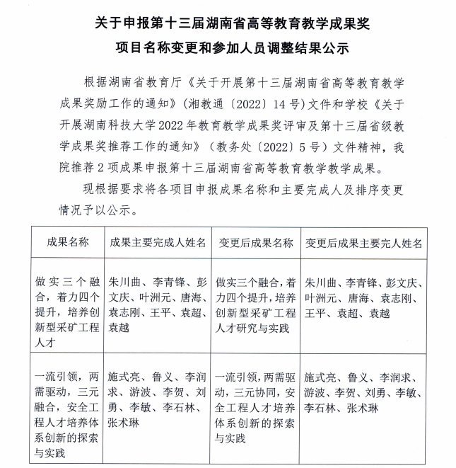 关于申报第十三届湖南省高等教育教学成果奖项目名称变更和参加人员调整结果公示