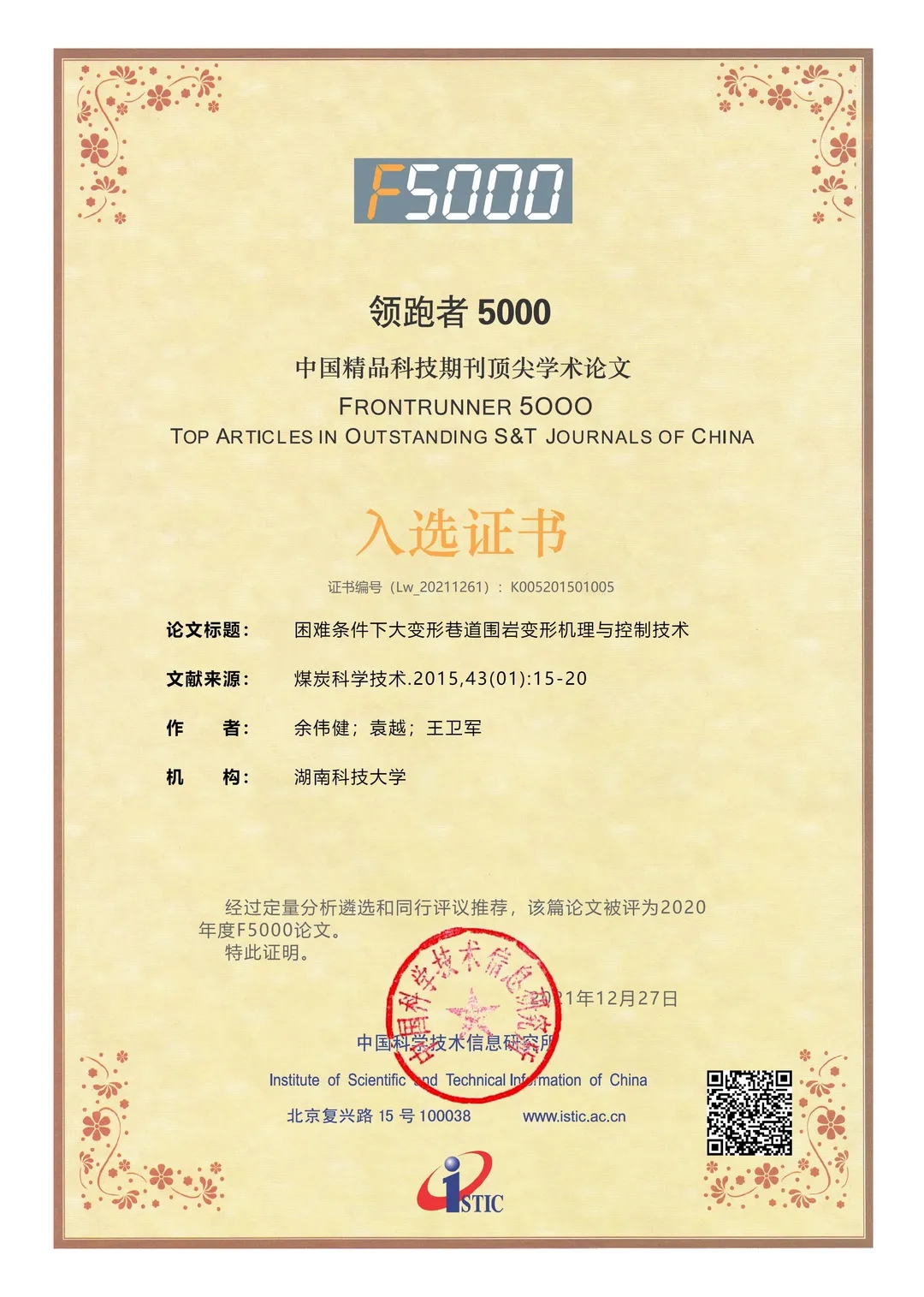 近日,中国科学技术信息研究所发布了2020年度“领跑者5000-中国精品科技期刊顶尖学术论文的评选结果,成人漫画余伟健教授、袁越副教授、王卫军教授在2015年第1期《煤炭科学技术》发表的论文《困难条件下大变形巷道围岩变形机理与控制技术》入选2021年“领跑者5000-中国精品科技期刊顶尖学术论文(F5000)"。