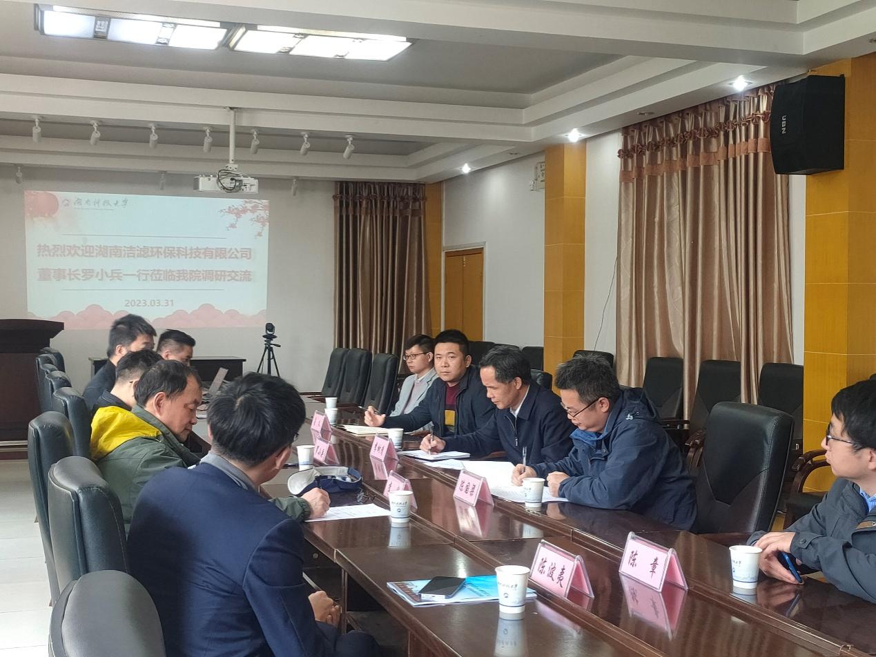 3月31日上午,湖南洁滤环保科技有限公司罗小兵董事长一行五人来成人漫画调研交流。座谈会在资安一号楼317会议室举行,成人漫画 党委书记李树清、副院长鲁义、副院长陈国梁及环境工程系教师等参加调研交流座谈会。